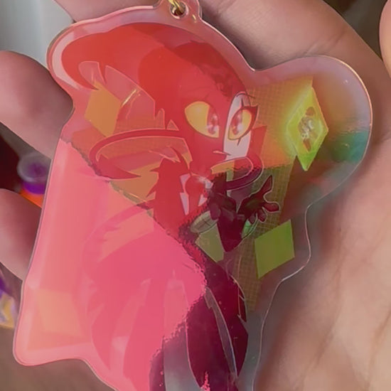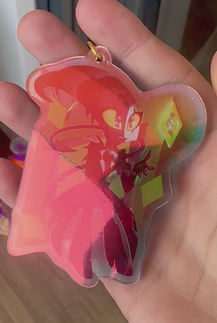Acrylic Keyring coated with a reflective yellow iridescent film on the back. Fixed with a gold clip and ring.