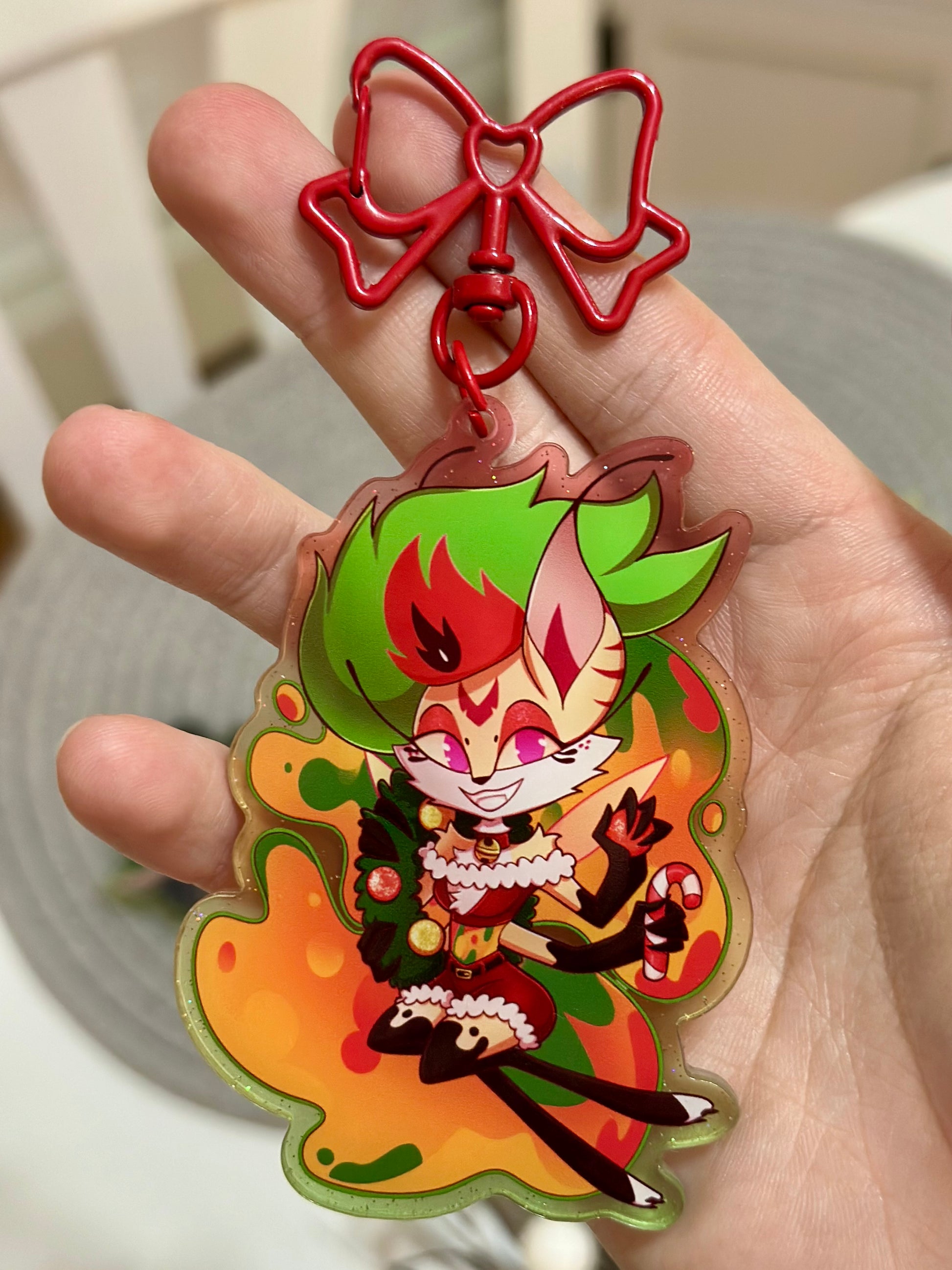 Keyring with a red bow-shaped clip. Pendant itself is 8cm in length.