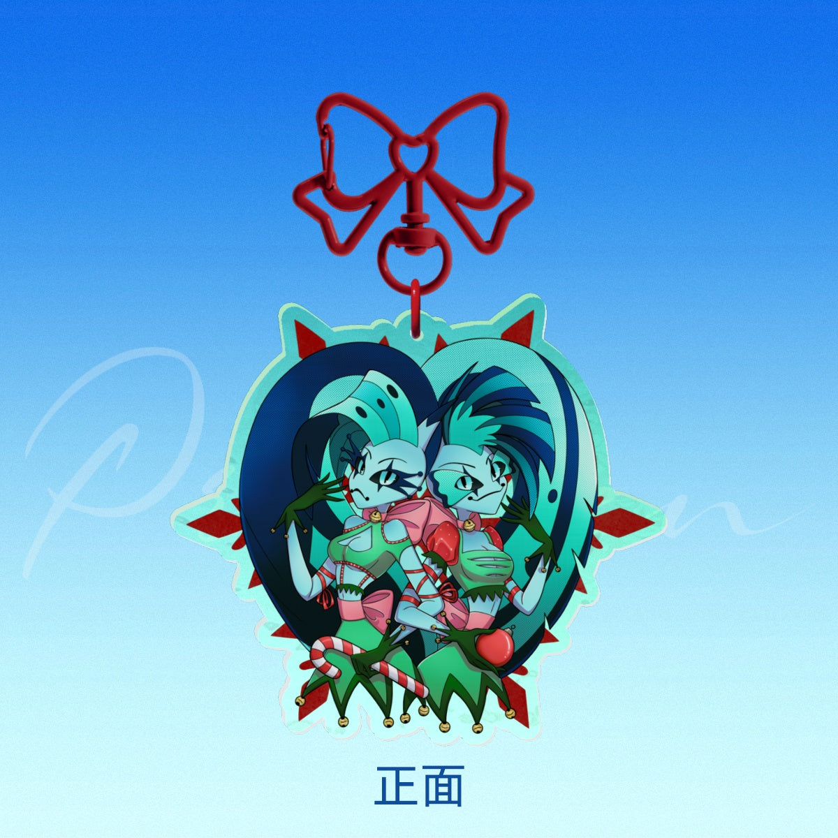 Keyring with a red bow-shaped clip. Pendant itself is 8cm in length.