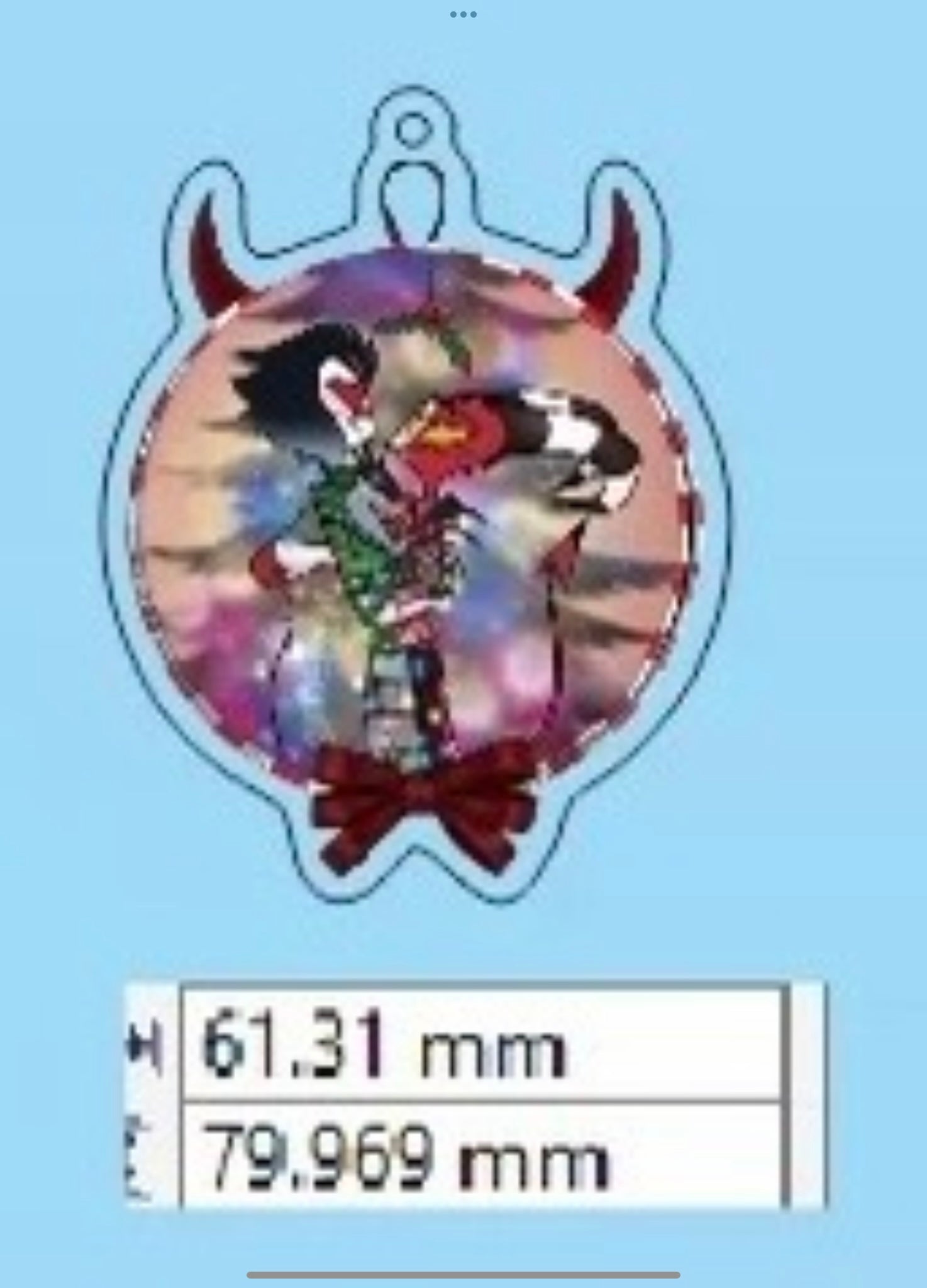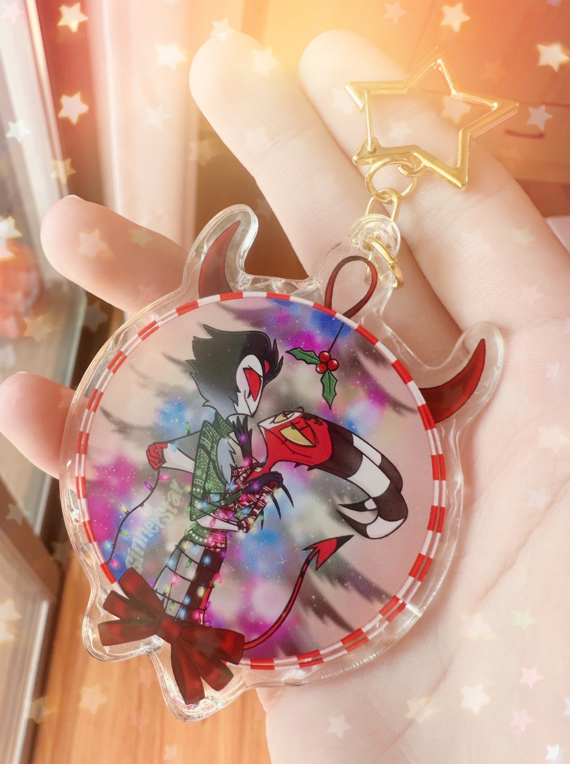Keyring with a short gold star-shaped clip. Pendant itself is 8cm in length which totals to roughly 12cm including the clip.